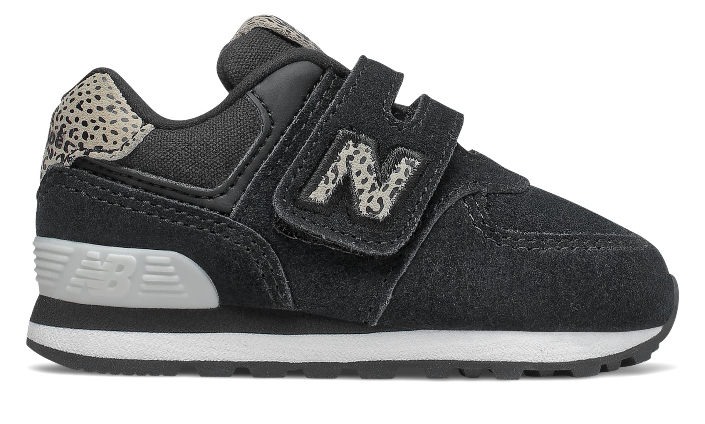 Families' active schedules call for a kids' sneaker that's stylish enough to complement any outfit and soft enough to keep feet cozy. With a cute animal print inspired by women's shoe designs, this 574 Animal Print for infants delivers iconic style in a clean and comfortable shoe. A cushioned midsole helps keep little feet feeling comfy and secure while a rubber outsole helps prevent wear-and-tear. The hook-and-loop closure strap makes it easy to get on and off little feet.